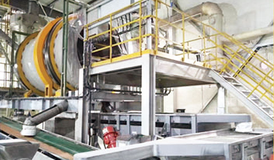 本设备主要由传动装置、支承装置、挡轮装置、筒体部件、顶升机构、混料耙子机构、喷雾加湿机构、气动刮刀机构、螺旋布料机 构和其他辅助部分组成。原粉通过可调速的螺旋输送机构均匀导入筒体,筒体内部设有可调节流量的喷雾加湿机构,原料随筒体旋转抛落、滚动、凝结、球化。